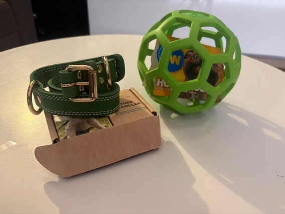 ✅ Stylowy Zestaw dla Twojego Pupila: Zielona Elegancka Skórzana Obroża + Wytrzymała Zabawka z Naturalnej Gumy